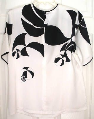 An easy to wear blouse from French designer Louis Feraud. This blouse is dark navy on bright white. The design could look Japanese or beachy, depending on how you look at it. The design is on the upper front and back Fine navy piping edges the short sleeves and neckline.