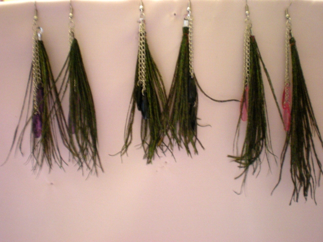 Feather earrings w/purple crystals.