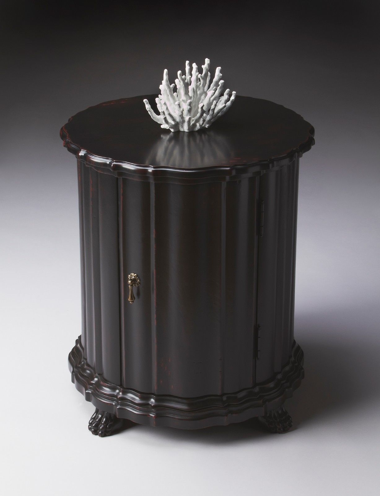 This meticulously sculpted Drum Table is crafted from select solid woods, wood products and choice veneers with hand-carved details. The rich finish is beautifully crackled and textured, and the door opens with antique brass finished hardware for convenient chairside storage.