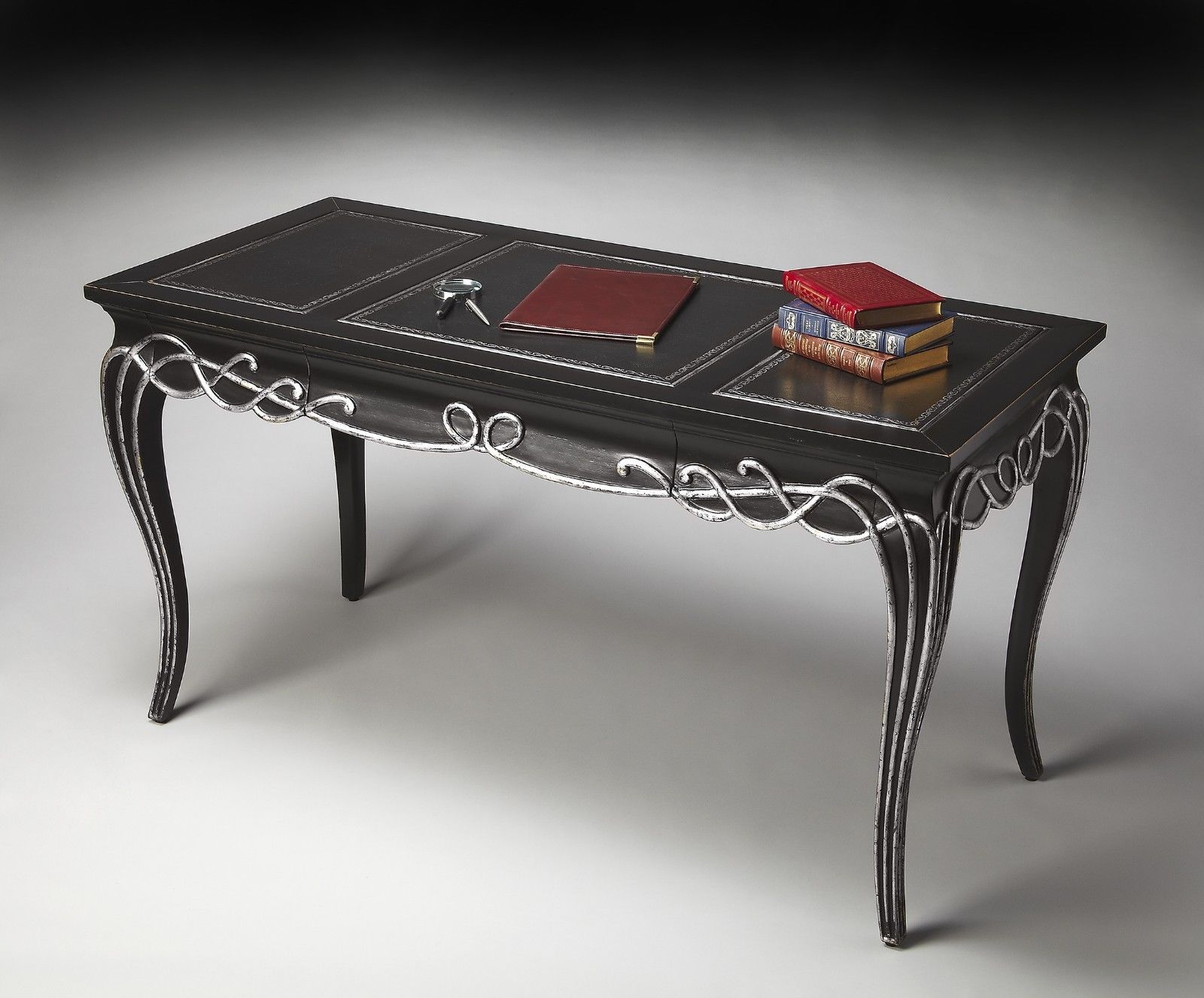 Black Writing Desk Leather Inserts Silver Painted Details Distressed Brand New