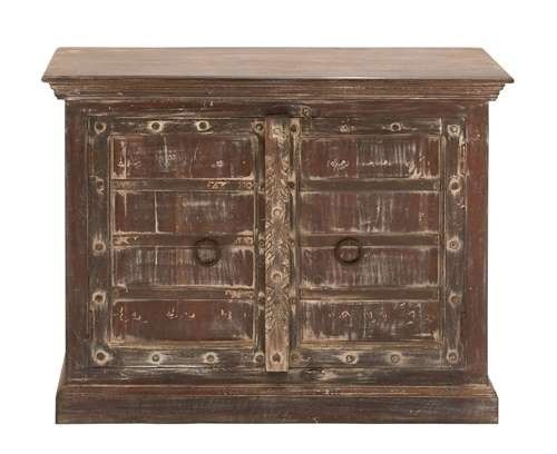 Get this Wooden Cabinet with an authentic worn finish that features great storage space and is sure to earn you generous admiration from your guests. With a cavernous storage space inside, you can put in all your favorite books, medicines, work-related documents, stationery and a whole lot more. Its true ld-style detailing is a work of art with a solid wooden base and a flat top artistically tapers down connect to the body. The twin side-by-side doors sport symmetrical design patterns with metal links attached to pull them open. The wooden stoppers on the right-hand door keep it closed, and its over-hanging edge prevents the other door from swinging open. You can place any showpiece or work of art on the flat top of this cabinet. With its durable construction, this is one antique cabinet that will last long. It comes with following dimensions: