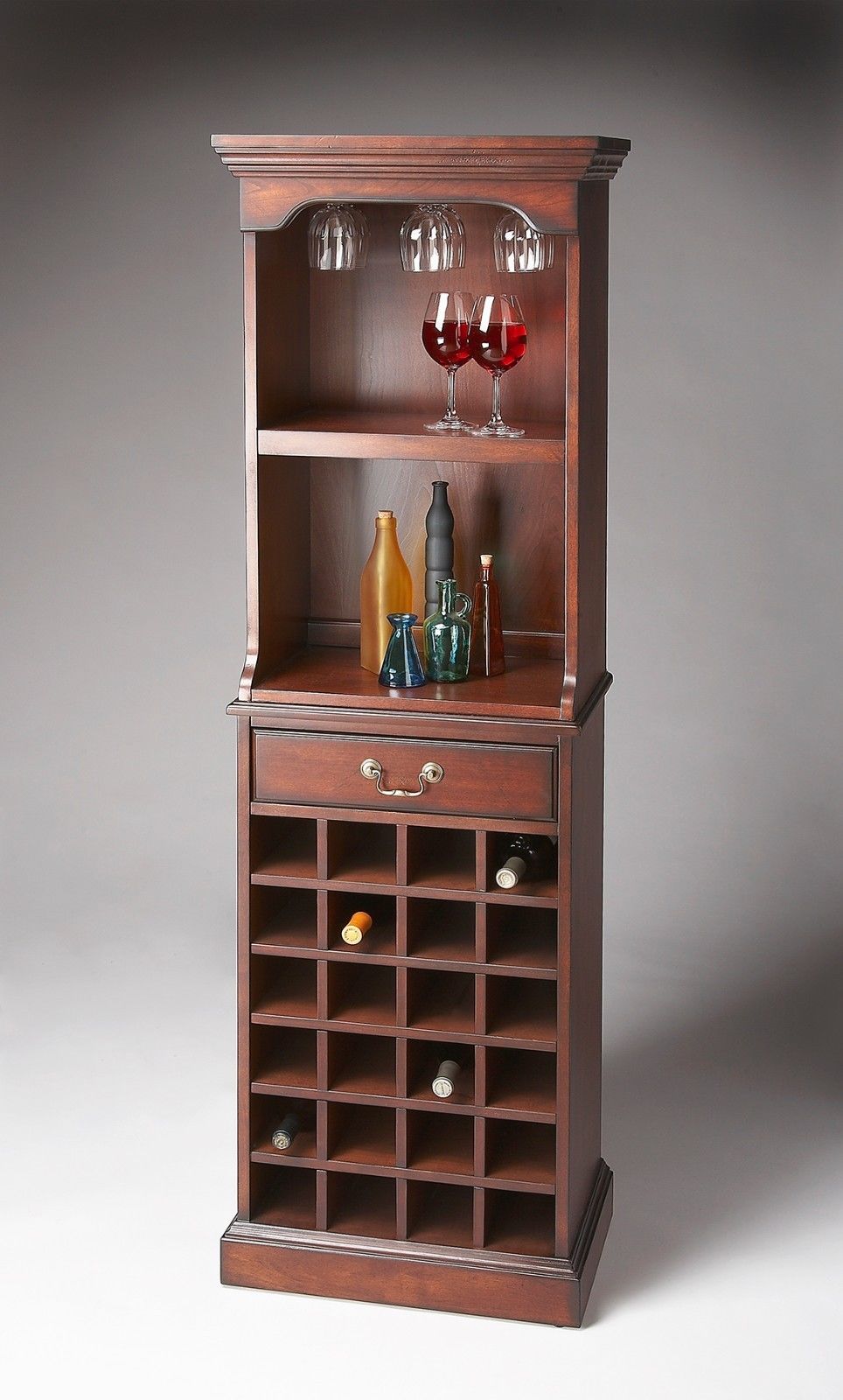 Balancing good looks with function, this wine cabinet is a great addition for in-home entertaining. Crafted from selected solid woods, wood products and choice veneers, it boasts a cherry veneer top, sides, fixed upper shelf, middle serving area, and drawer front. It holds up to 24 bottles of wine, has a built-in stemware rack, and one drawer with antique brass finished hardware.