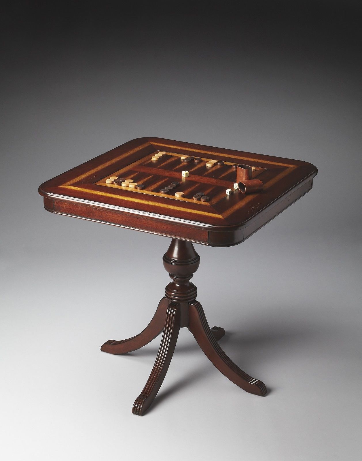 Form and function distinguish this game table. Hand crafted from hardwood solids and wood products, it features four delicately carved legs and an urn pedestal delivering style and stability. The reversible game board plays chess and checkers on one side, and backgammon on the other. Both sides have inlays of maple, walnut and select cherry veneers. Game pieces are not included.