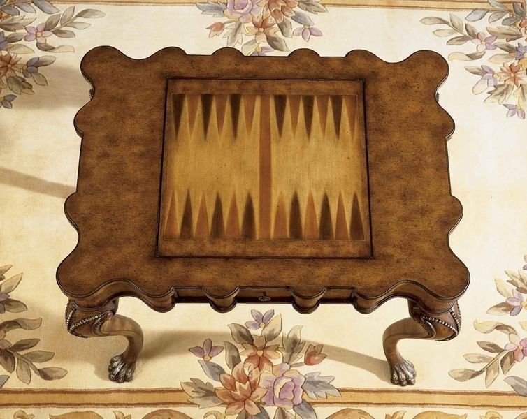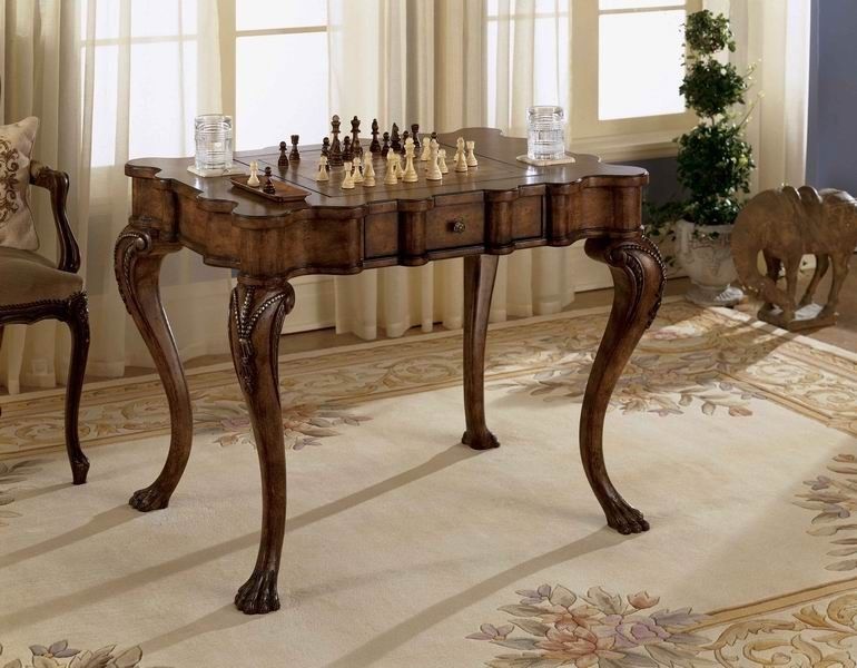 This Game Table, crafted from select solid woods and choice veneers, features meticulously hand-carved details, a reversible game board with chess on one side and backgammon on the other, two drawers with antique brass finished hardware, and all game pieces for chess, checkers, backgammon and cribbage.