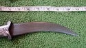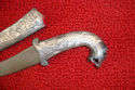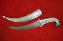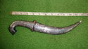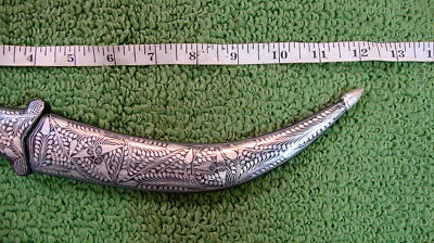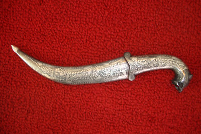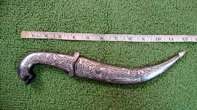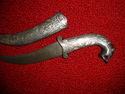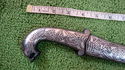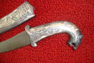 A SILVER WIRE KOFTGIRI WORK HALF SWORD LION FACE WITH RAIN DROP DAMASCUS BLADE OVER ALL 12 INCHES LONG , SCABARD ALSO OF METAL WITH S AND SILVER WORK . IT IS TOTALLY HAND MADE NO MACHINE WORK , METAL IRON . BLADE IS UNSHARPED . NEW PIECE DECORATIVE .