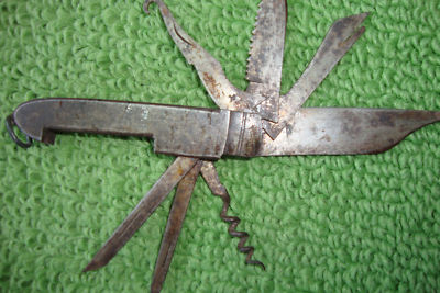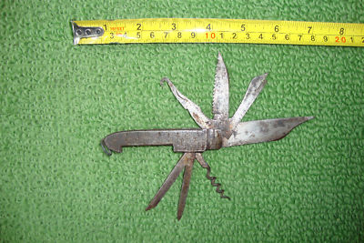 ANTIQUES EIGHT FUNCTIONS FOLDING KNIFE METAL IRON , ALL FUNCTIONS WORK WELL NO DEFFECTS OR DAMAGES , I DO NOT SEE ANY MARKINGS OR MANUFACTURERS NAME MAY BE WIPED OUT DUE TO OLD .