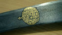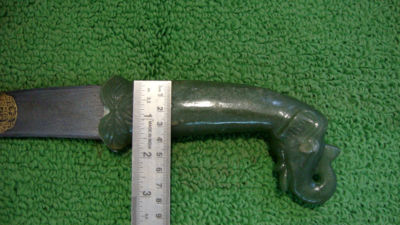 A NEW DAGGER DAMASCUS BLADE WITH GOLD STAMPING , NICE JADE STONE REPLICA ON HANDLE .