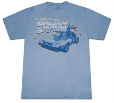 Officially licensed Back To The Future Time Machine Heather Blue T-Shirt. Features a classic movie logo and time machine design. Cotton/poly blend.