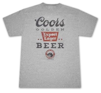 Officially licensed Coors Golden Beer Export Lager Heather Gray T-Shirt. Features a classic black and red Coors logo on the front of the tee. Cotton/poly blend.
