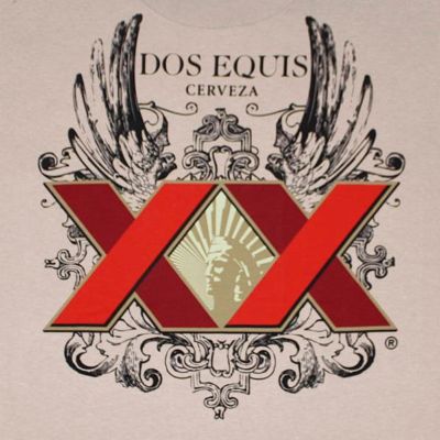 Officially licensed Dos Equis Crest Tan T-Shirt. Features a large Dos Equis logo with a black winged design in the background. 100% cotton