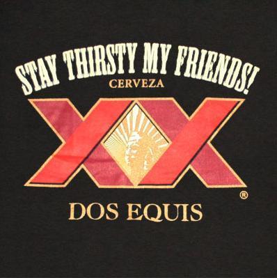 Officially licensed Dos Equis Stay Thirsty Black T-Shirt. Features a large logo on the back that says, Stay Thirsty My Friends! Includes smaller chest logo on the front. 100% cotton.