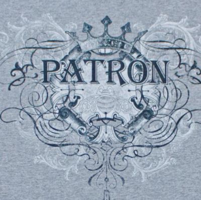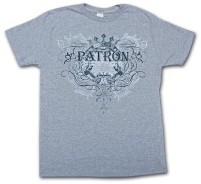 Officially licensed Patron Scrollwork Design Heather Grey T-Shirt. Features an ornate Patron print on the front. Cotton/poly blend.