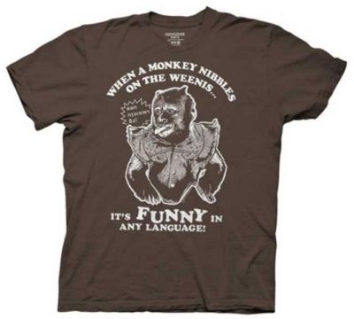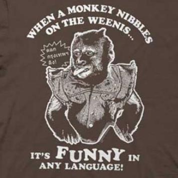 Officially licensed The Hangover 2 Monkey Nibbles Weenis Brown T-Shirt. Features a print based on the new sequel that says, 'When a monkey nibbles on the weenis... it's funny in any language!' 100% cotton.