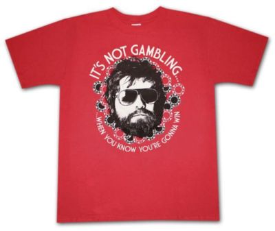 Officially licensed The Hangover Not Gambling Alan Red T-Shirt. Features Alan on the front and says, 'It's not gambling when you know you're gonna win.' 100% cotton.