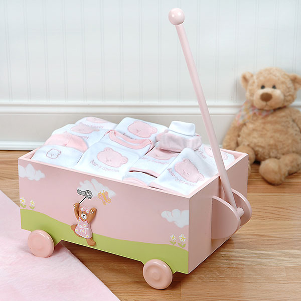 The big day has arrived, the baby is here... time to roll out the welcome wagon! The lovely girl bear ornament chases butterflies through a flowery meadow, her dainty dress and bow matching its summertime pastel colors. Each wagon features four rolling wheels and a trusty handle, for carting all sorts of valuables and memories-in-the-making. This wagon's treasure for parents, however, lies inside: a complete layette and bath gift set, with charming bear faces and un-bear-ably charming inscriptions. They're made of soft 100% interlock cotton, that's machine-washable, so clean up is simple and quick. Each set includes:  "bear-y clean" hooded terry cloth towel. "bear-y sleepy" receiving blanket "bear-y sleepy" sleeping gown "bear-y special" long-sleeved bodysuit "bear-y special" short-sleeved bodysuit  "bear-y hungry" bib  "bear-y" messy burp cloth terry velour washcloth one pair of booties  snuggly hat Layette and bath items available in size 0-6 months. Wagon measures 16" x 11" x 8".  Personalization is available at an additional cost and takes 5-7 business days production time.