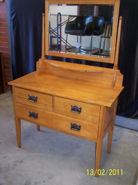 In silky OAK ( solid timber ) and ornate metal handles ( all complete in perfect condition ) and dovetailed side joinery on the drawers. The mirror is bevelled edge and can be angled up or down to suit. Easy to unclip from Table to remove for transport ease ... This really have been made with Quality Design and Craftsmanship. .. will go with most decor .... and last forever !