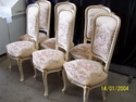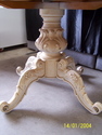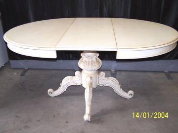 Timber craved with very ornate base with Gold Gilt narrow edging on legs. Table can be ROUND or folded out to comfortably seat 6/8 persons. Original color of ( Antique white ) with matching fabric will go with most decor. This setting cost the owners a fortune ..... but not here at Mrs.Secondhand!