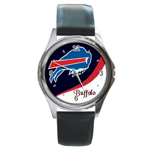 Buffalo Bills Unisex silver-tone high quality watch. The watch casing measures approx. 1 1/2" in diameter, the watch band fits most wrists from approx. 6 1/2" to 8". The watch band is made of genuine leather. Stainless steel back Miyota watch movement made by Citizen. The battery for the watch is included.