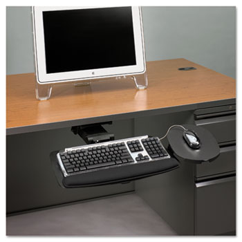 360 swivel plus finger-controlled pull-latch for independent 30 platform tilt, 5 1/2" height adjustment. Easy height adjustmentno levers or knobs. Smooth Teflon glide track. Workstation TypeStraight. 17" travel appropriate for corner worksurface applications deeper than 24". Color(s): Black; Keyboard Tray Dimensions (W x D): 20 3/4" x 11"; Mouse Tray Dimensions (W x D): 9 1/4" x 8 1/2"; Height (+/- Desktop): +0.6"/-8.1".