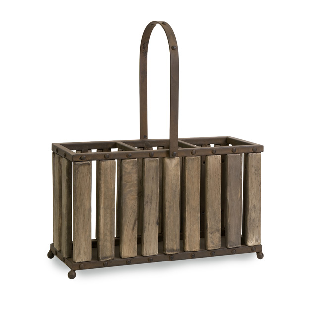 Beautifully hand crafted wine bottle holder features an intricate antique industrial design Holds (3) bottles of wine Approximate dimensions: 8.5"H (17.5" including handle) x 14.5"W x 5.5"D Material(s): wrought iron/pinewood