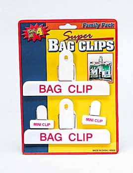 No kitchen should be without a set of these useful bag clips. Ideal for closing bags of chips and pretzels, plastic bags and they can also be used to keep other items, like rice, crackers, and beans, fresh. Using these wholesale bulk cheap discount bag clips can make the grocery budget go further because food doesn't get stale as quickly. Set includes one large bag clip, one medium clip and two smaller clips." Case Pack 120