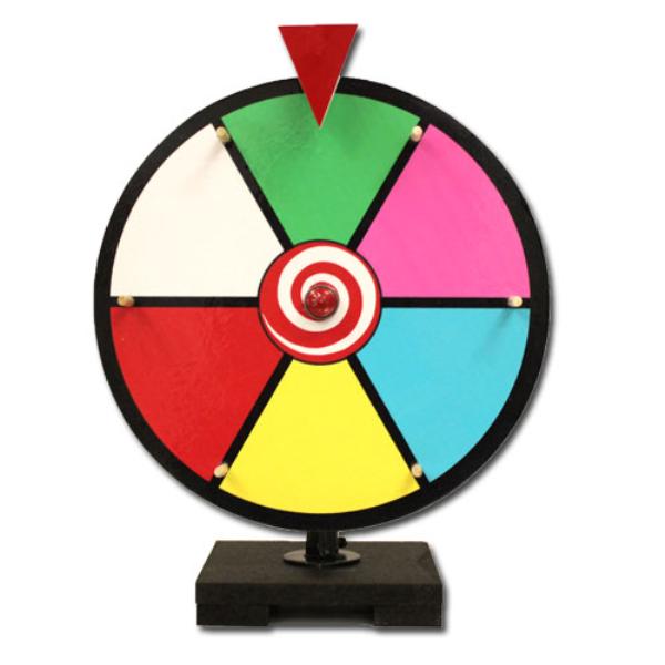 12"" Color Dry Erase Prize Wheel This Prize Wheels sturdy design is backed with a 1 year replacement guarantee. New handcrafted 12 inch spinning prize wheel. Solid and sturdy construction with dual bearing hub and a stable base. The face is digitally printed and sealed with dry erase laminate. This is a true dry erase laminate that when used with a dry erase marker can be wiped clean with a dry cloth. Wheel is cut from 1/2 inch thick pressure treated particle board and fitted with wooden pegs for a great clicking sound. Dimensions: Wheel: Approx 11 1/2 inches in diameter Base: Approximately 14 inches tall." Case Pack 1