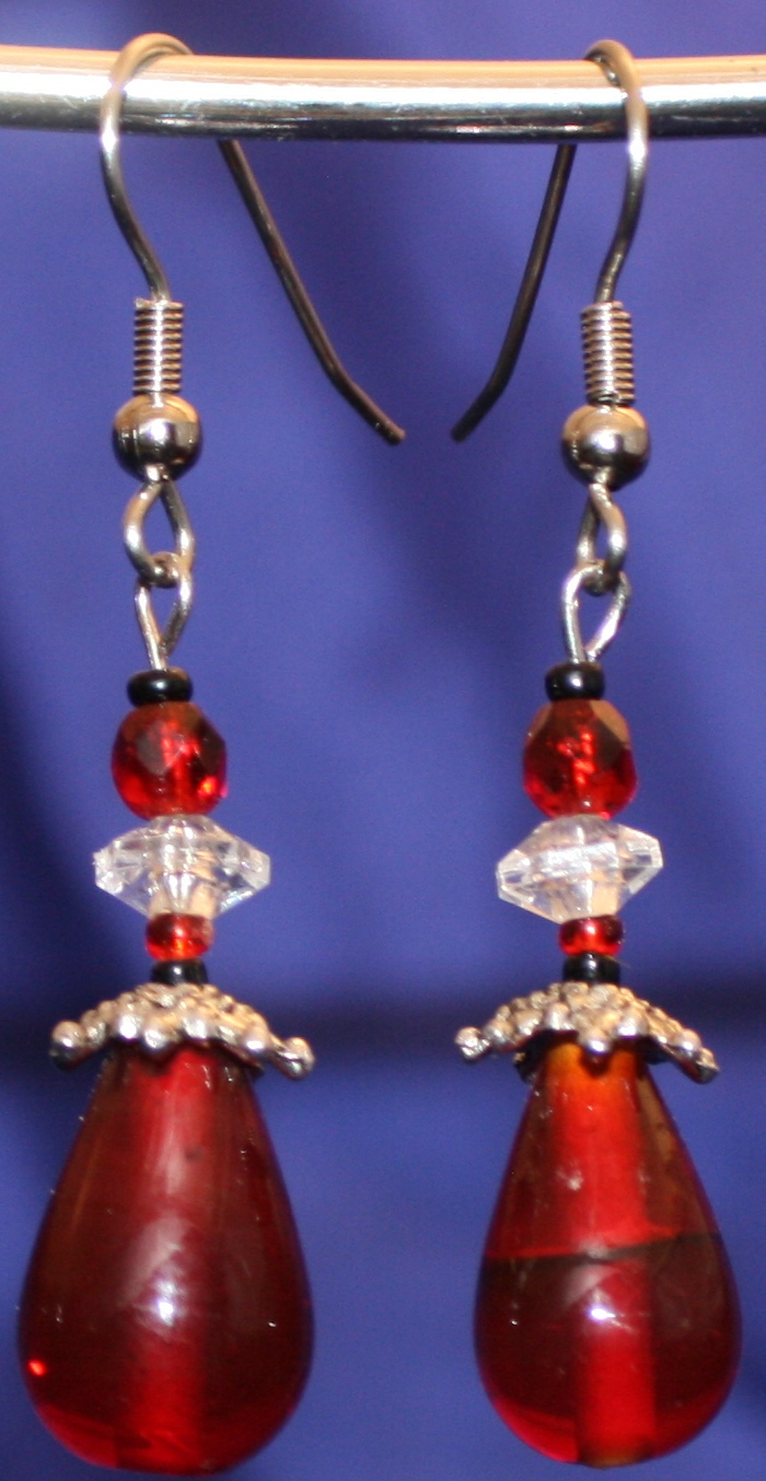 Add a spark of bold color to that sexy black dress or dress up a casual t-shirt and jeans combo with these bold yet beautiful crimson colored glass drop earrings. These gorgeous earrings measure 1.5".