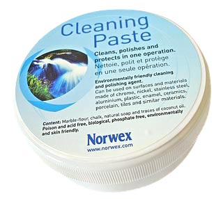 An environmentally friendly paste that cleans, polishes and protects materials mode of chrome, stainless steel (except brushed stainless steel), aluminum, porcelain and similar surfaces in one application. Rub onto surface area with a damp Enviro Cloth, rinse with water, and polish with a dry Enviro Cloth. Safe for use on coffee pots, glasses, and most food-ware products. NOT for use on brass or silver. Always test on an inconspicuous surface, if you are concerned about the possibility of scratching.