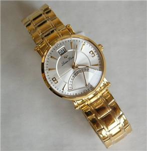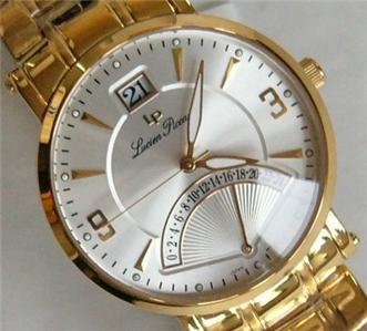 RET $475 Elegant LucienPiccard watch. Technically a man's watch, but women who like larger watches might enjoy this, too. The 24 hour fan shaped subdial makes it especially unique; I've never seen another one like it. Round luminous dot markers at all hour positions and gold-tone Arabic numerals at 3:00 and 9:00. Big date window at 12:00 and a 24-hour subdial above 6:00. Includes Lucien Piccard box, case and warranty.
