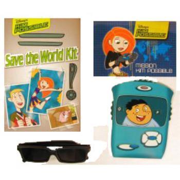 "Kim Possible save the world kit comes with sunglasses that let you see behind, coded messages, Kimmunicator to decode them, and an iron on patch." Case Pack 12