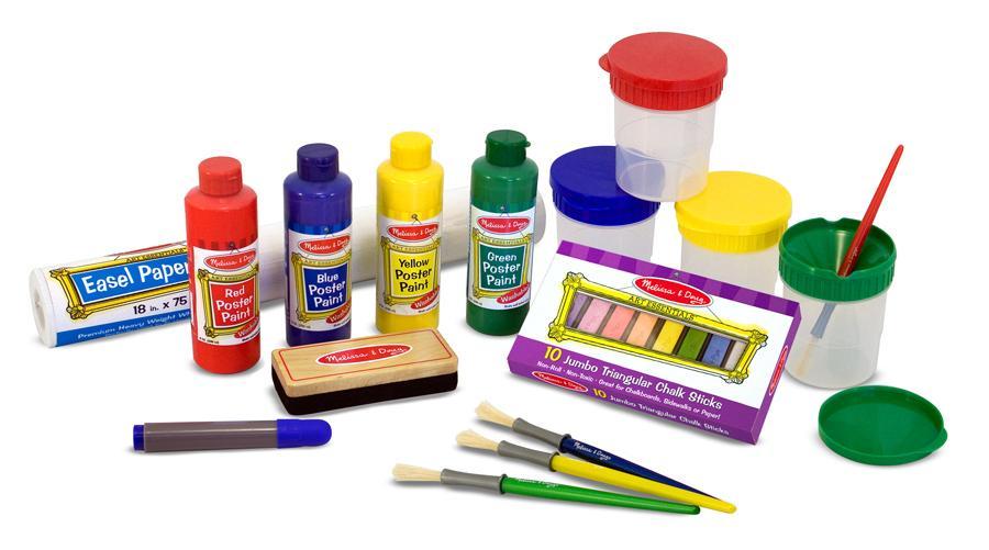 Everything your young artist needs when inspiration strikes! Four eight ounce bottles of vibrant poster paint (R/B/Y/G), four spill-proof paint cups, four medium sized brushes, a roll of easel paper, a 10-pack of jumbo rainbow chalk, an eraser, AND a dry erase marker.