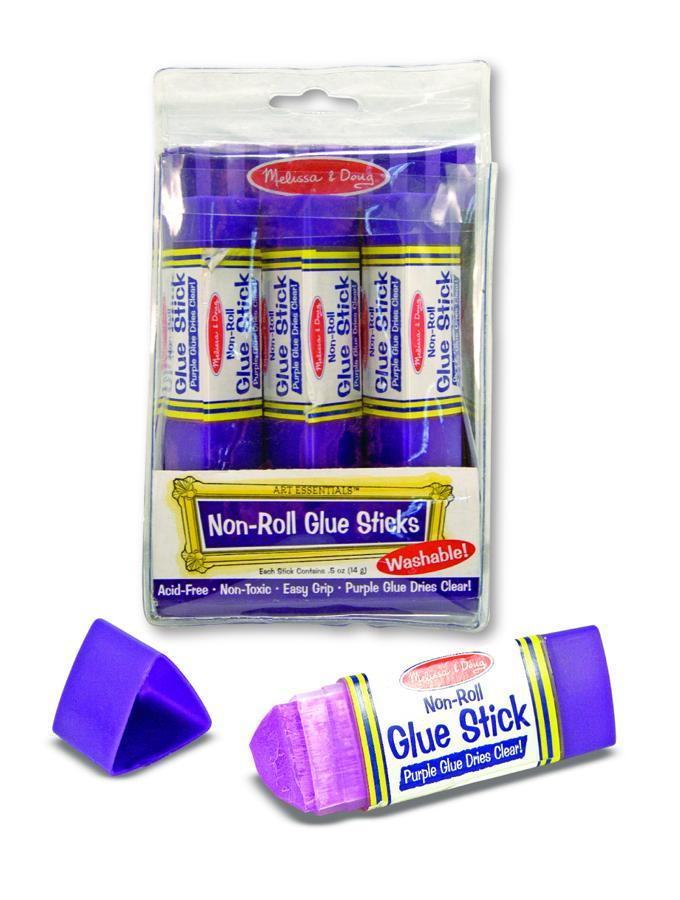 The perfect gliding glue that goes on purple and dries clear! This craft glue is acid-free, non-toxic and washable! Three easy to grasp, non-rolling sticks in a handy phthalate-free storage pouch. The unique shape will help develop the preferred grip for later writing skills.