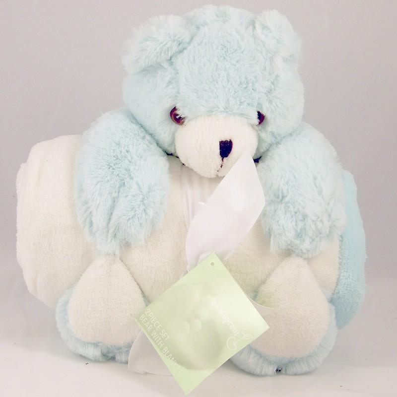 Fun stuffed bear holding a crib blanket. Hand wash only, use mild detergent, rinse thoroughly. 100% hypoallergenic polyester crib blanket. Made in China.
