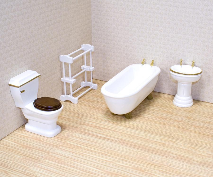 This 4-piece bathroom set has everything needed for this necessary room. The handcrafted solid wood pieces with period details are perfect for all 1:12 scale dollhouses! The set includes a sink, a tub, a toilet and a towel rack.