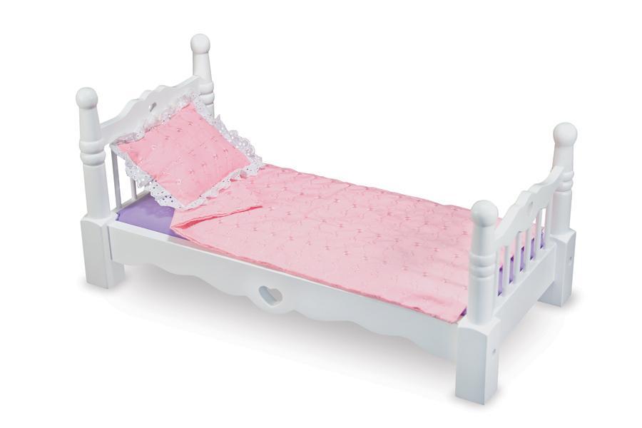 Our lovely wooden doll bed is painted white to suit any dcor and features turned posts and cut out heart details. Dolls up to 20 can be tucked in for the night with a pillow, a blanket and a mattress, all included!