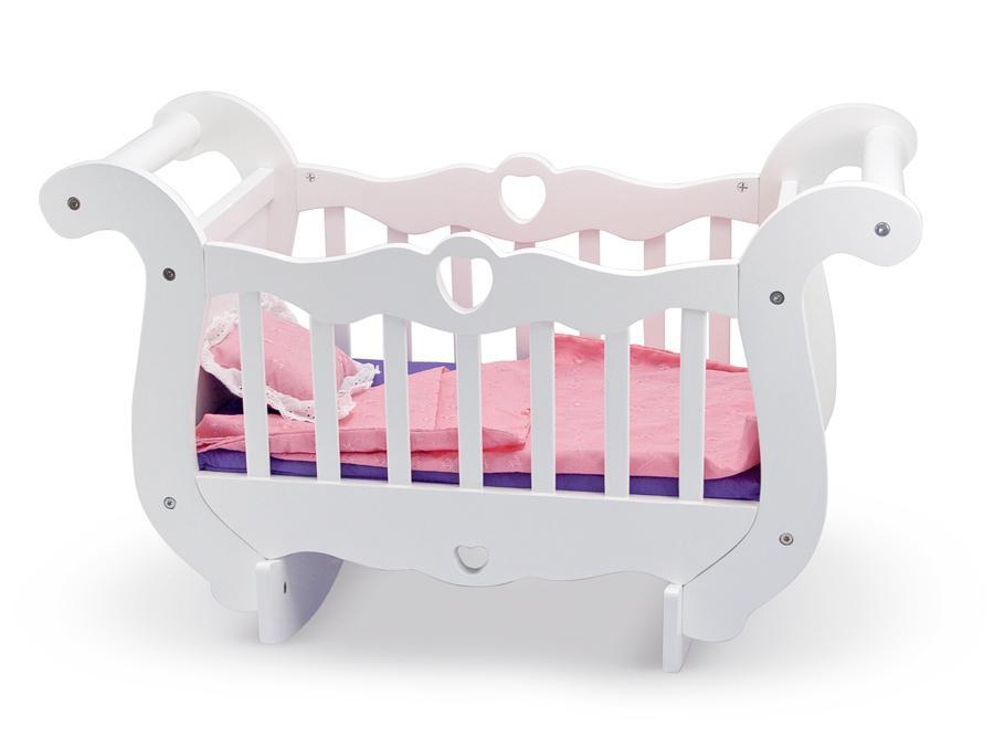 This wooden rocking doll crib will delight little mothers! Baby dolls up to 20 can snuggle in cozy comfort with a pillow, a blanket and a mattress, all included! Suitable for any dcor, this white crib also features heart cutouts for loveable style.
