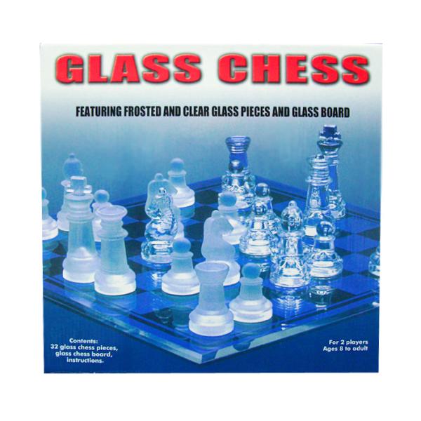 "32 frosted and clear glass chess pieces, glass chess board and instructions. 14"" x 14"" Glass Chess set in gift box packing." Case Pack 4