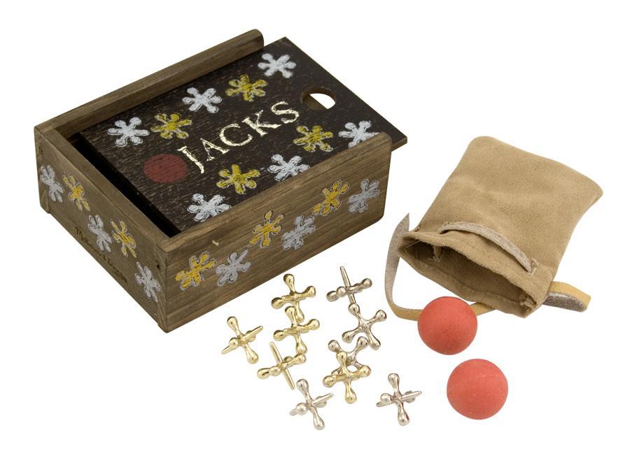 This, classic playground game, has been enjoyed by children for hundreds of years. Now its time for a new generation to discover the fun! This set includes five silver and five gold jacks, plus two rubber balls. Store the set securely in a handy suede-like pouch that fits neatly in an heirloom quality solid-wood box with a sliding lid! A detailed instruction booklet is included.