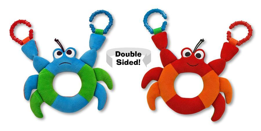 Whether happy or crabby, this double-sided soft toy expresses the appropriate mood! This easy-grasp toy with colorful, textured teething rings is an adorable first friend. The rings can hook onto a stroller or other toys for safekeeping. Constructed of high quality fabrics and phthalate-free plastic for durable play.