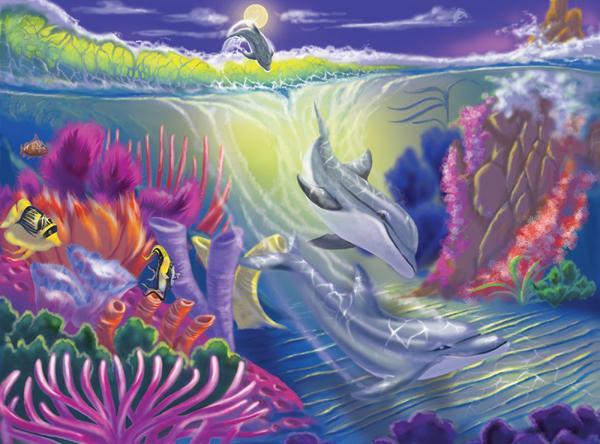 Enjoy assembling this beautiful scene of bottlenose dolphins at play in the light of a full moon. The thick, durable pieces of this 100-piece puzzle when assembled, feature a detailed underwater scene. This best quality cardboard jigsaw puzzle represents a great value! Bright, sturdy packaging will withstand many uses.