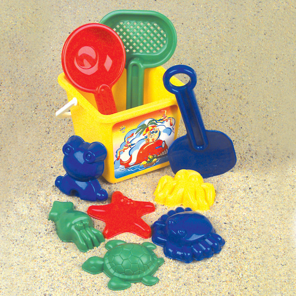 "A must for excursions to the shore. This 10-piece beach set includes shovels, molds, and a pail. Each set in netted bag." Case Pack 12