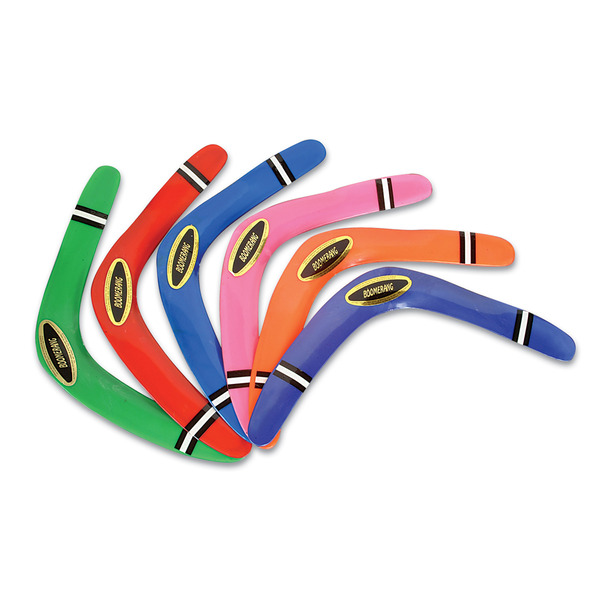 "This plastic boomerang is a time-honored recreational apparatus that when thrown correctly, will come right back to you every time. The fun lies in learning the correct technique. Color assortment includes blue, green, orange, pink, purple, and red. Each piece in polybag with printed header." Case Pack 48