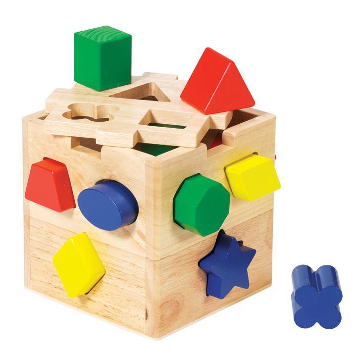 The ultimate shape sorter! Features 12 chunky, vibrantly colored shapes that make a satisfying clink as they drop into the natural finished hardwood cube! Then open the lid, take them out, and start all over again!