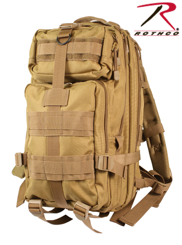 Coyote Brown Medium Transport Pack constructed of heavyweight 600 denier polyester MOLLE compatable padded back and padded shoulder straps with breathable mesh backing. Includes large main compartment with zipper pouch, mesh pockets, three additional zippered pockets, water repellant lining, hydration bladder compatable. SKU: 2289. Manufactured by Rothco.
