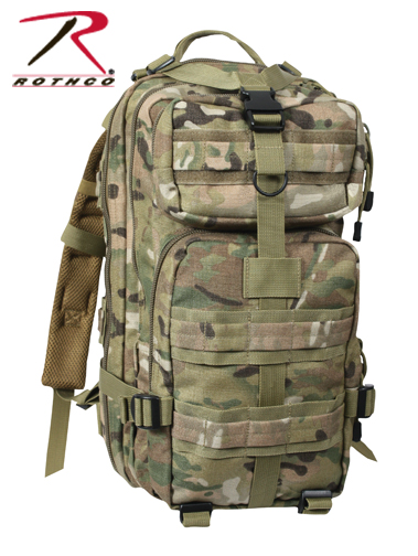 MultiCam Medium Transport Pack Constructed of heavyweight, made in USA nylon with polyurethane lining to repel water. Includes padded shoulder straps, breathable mesh back and heavy duty zippers. Item is MOLLE compatible. Main compartment measures 17" x 8" x 4.25", plus three rather large pockets. SKU: 2940. Manufactured by Rothco.