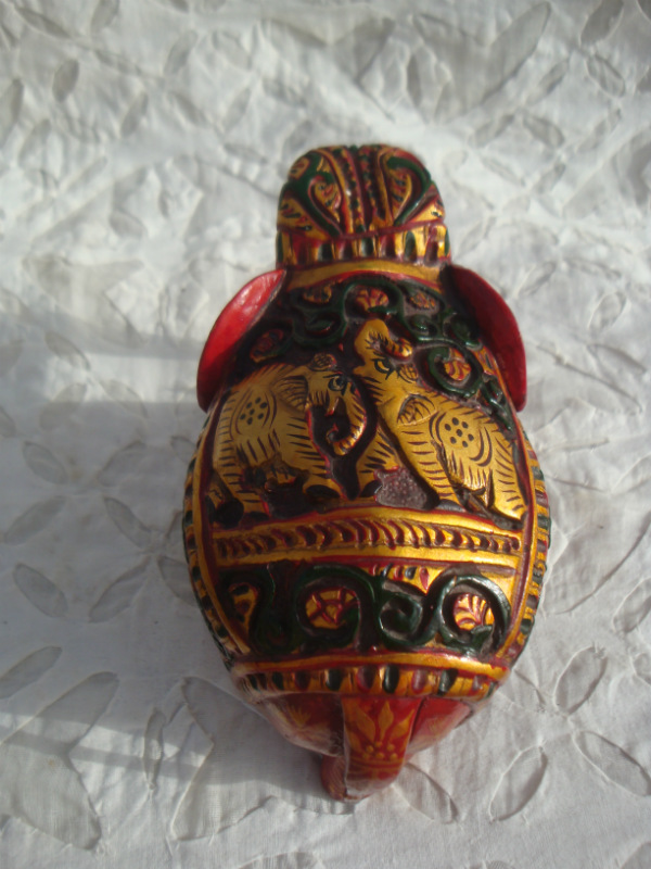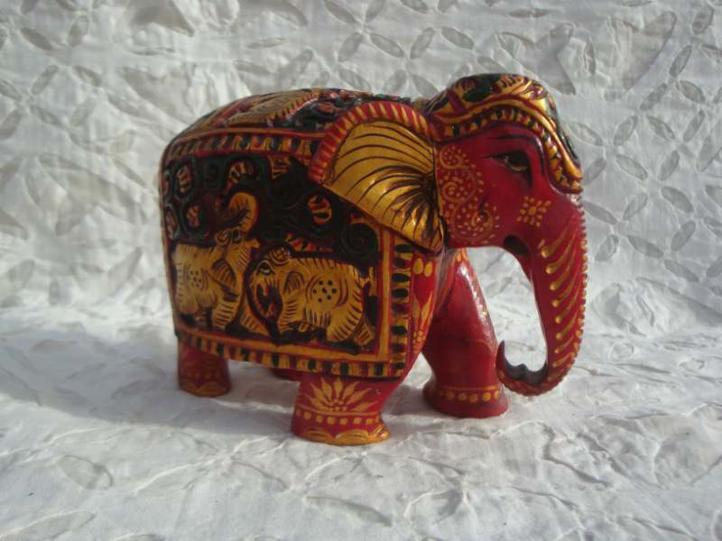 These wooden elephants are hand carved and painted and each depict different scenes within their designs. Each piece is unique.