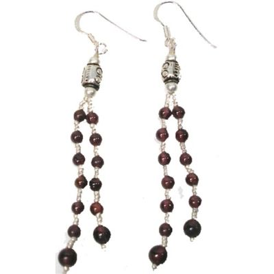 Two strands of deep red, slightly-graduated garnets alternating with sets of 3 tiny silver beads accented with etched Surin beads make up these stunning earrings. Silver is .925 grade. The beads hang 2 inches from the Sterling silver earring findings. Silversmiths in Surin, northeastern Thailand use simple tools to create distinctive beads from pure silver. The decorative patterns are hand-etched onto the surface of each bead. This painstaking intricate process, from the centuries-old Khmer Angkor kingdom , survives in only one small community.