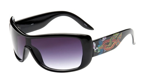 These affordable Ed Hardy Inspired Woman's Tattoo One-piece Lens Sunglasses offer full UV400 Protection and a stylish look without the price tag of high-end designer sunglasses. Available in an assortment of colors and designed for the budget-conscious, this stylish pair of sunglasses comes with a Black frame color and Purple lens. Remember, with Pear Sunglasses your shipping is only $2.95 for your entire order, so you can pick multiple colors and have the perfect pair for every occasion.