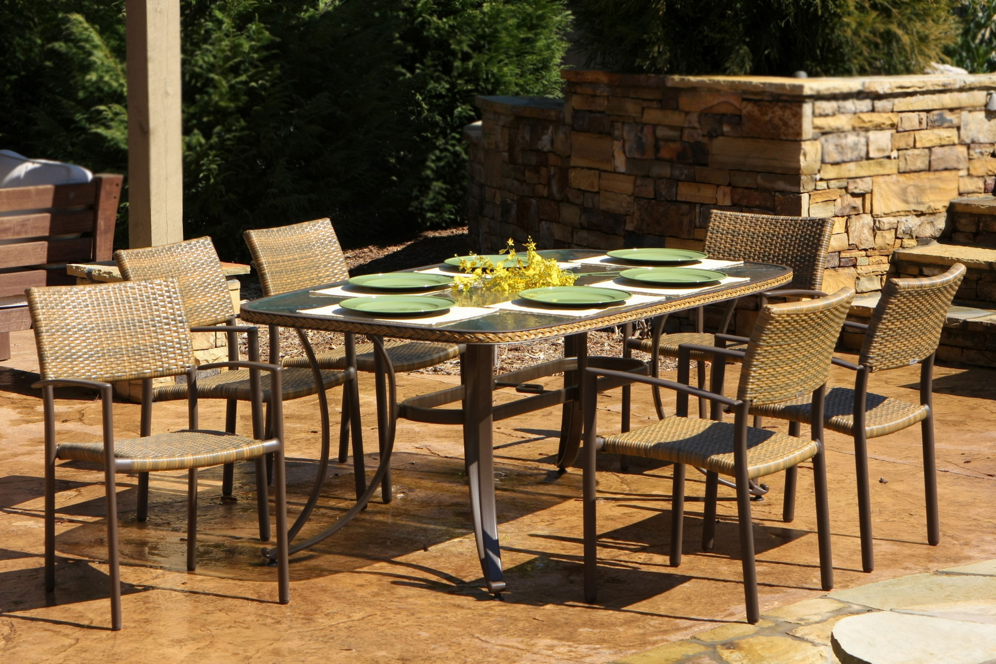 * All-weather wicker - unlike natural wicker, our all weather wicker is stain, water, uv, crack and split resistant * Double wicker weave for added comfort and durability * Powder coated aluminum frames are light weight and will not rust * Seadrift pattern tempered glass top * Umbrella hole in table center * Stackable chairs for quick and easy storage * Tree bark wicker with antique gray finished frame * Stainless Steel Hardware * 2 year limited warranty