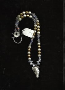 This Necklace is designed and crafted by RJ Waugh. A 20in handmade necklace with natural Freshwater Pearls, colored and Mother of Pearl Pendant, handstrung with pure sterling silver. This piece shows it's true beauty with the lustrious eligence of the Freshwater Pearls.